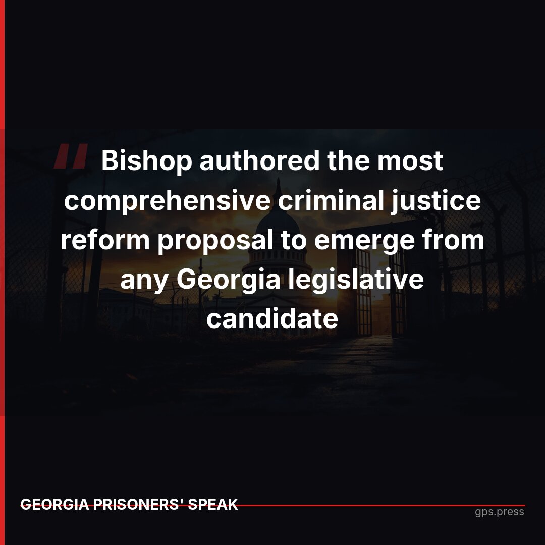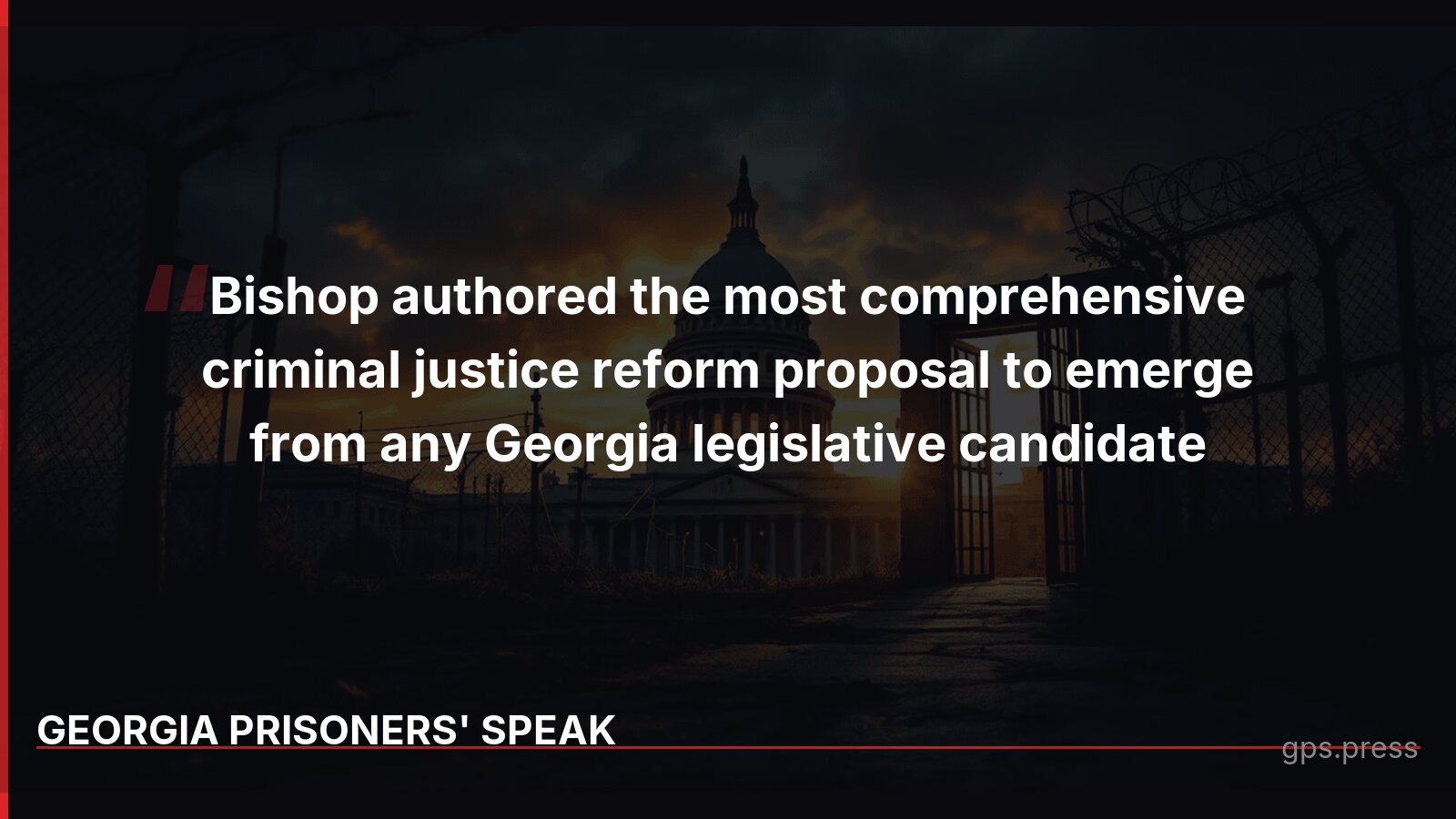 Bishop authored a sweeping reform proposal titled the Georgia Second Chance and Smart Justice Reform Act, which GPS analyzed in detail in March 2025. The bill is one of the most ambitious reform packages proposed by any Georgia legislative candidate, covering earned time credits, judicial second-look review, youth offender review, compassionate and geriatric release, mandatory reentry planning, record sealing, a rehabilitation roadmap for lifers, and an independent oversight commission.