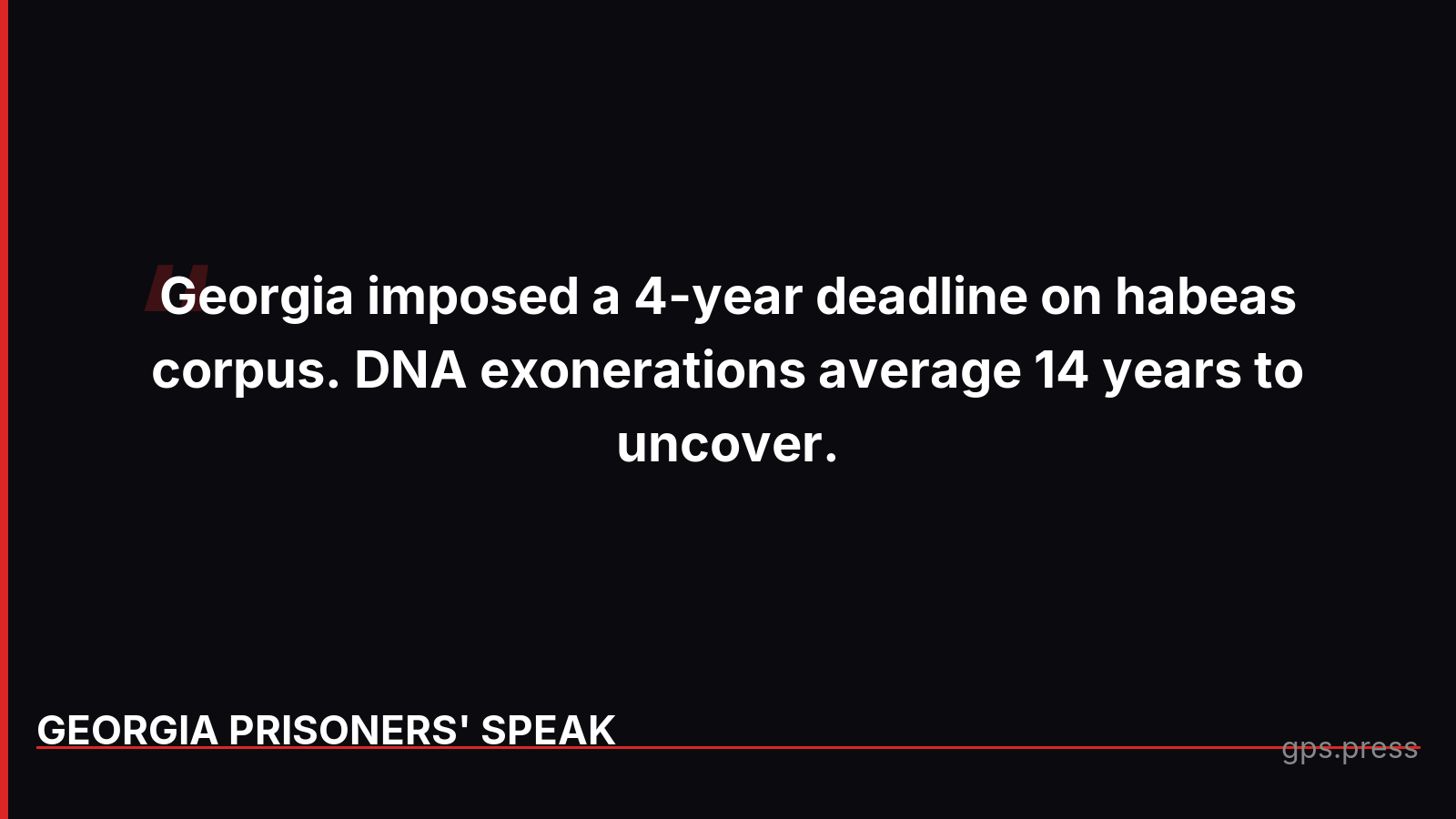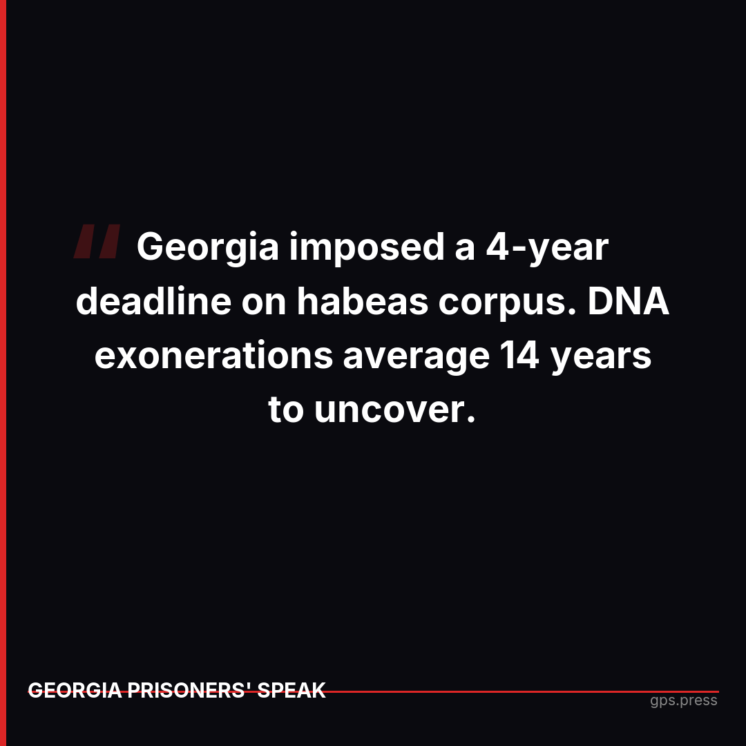 Georgia's Supreme Court Chief Justice Nels Peterson recently issued a remarkable concurring opinion acknowledging that the state's post-conviction legal system is 'a mess' created by the court's own decisions over several decades. This admission comes as conservative estimates suggest between 1,055-2,637 factually innocent people may be trapped in Georgia's prison system by procedural barriers that prioritize finality over justice. Georgia's 2004 imposition of a four-year deadline on habeas corpus petitions — the first such limit in state history — effectively suspends constitutional protections for anyone who discovers evidence of their innocence after that window closes. The average DNA exoneration takes 14 years to develop, but Georgia's system assumes all evidence of innocence will surface within four. This represents a fundamental departure from 800 years of legal tradition dating back to the Magna Carta. https://gps.press/blackstone-is-dead-georgia-abandoned-american-justice/
