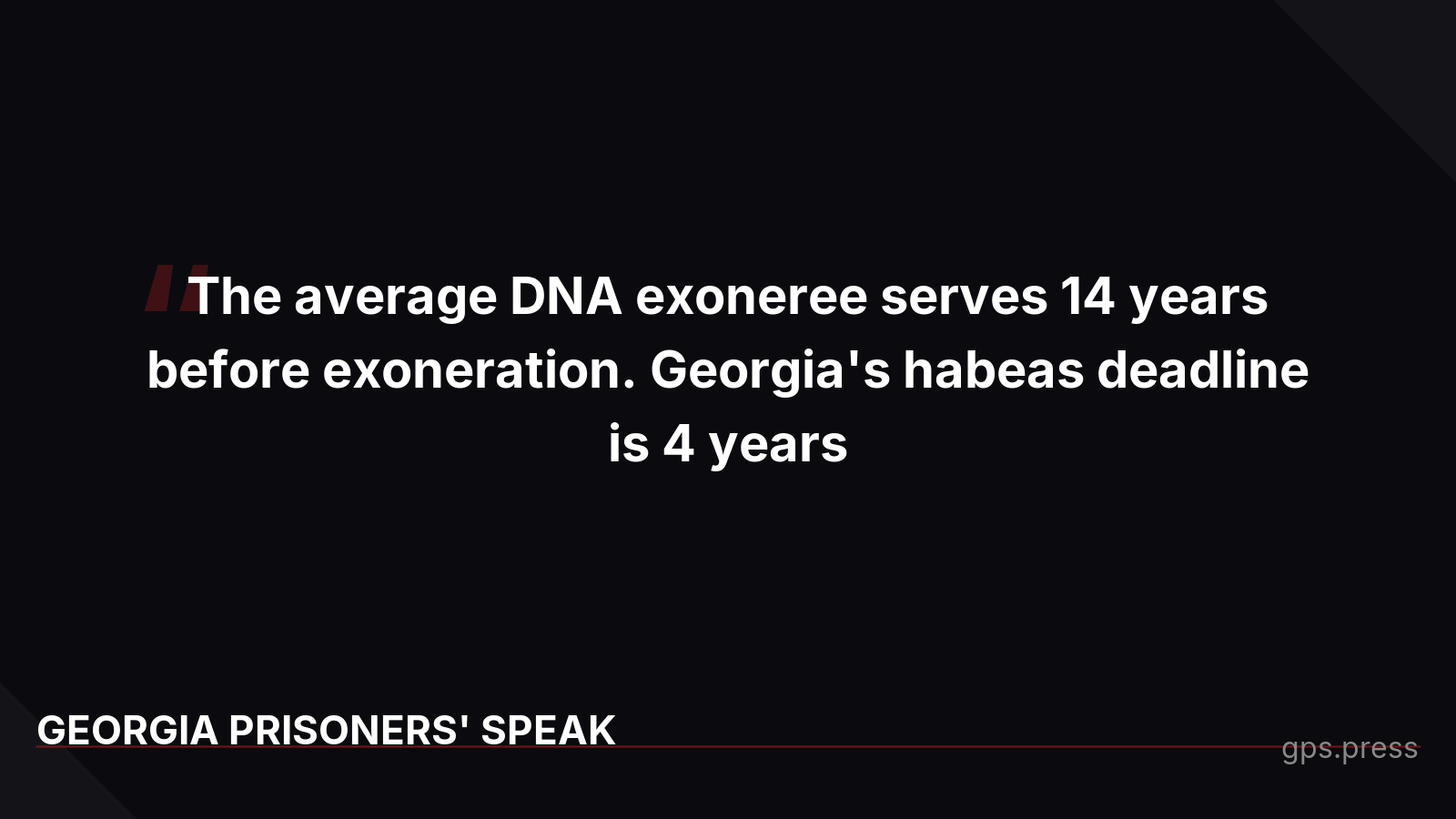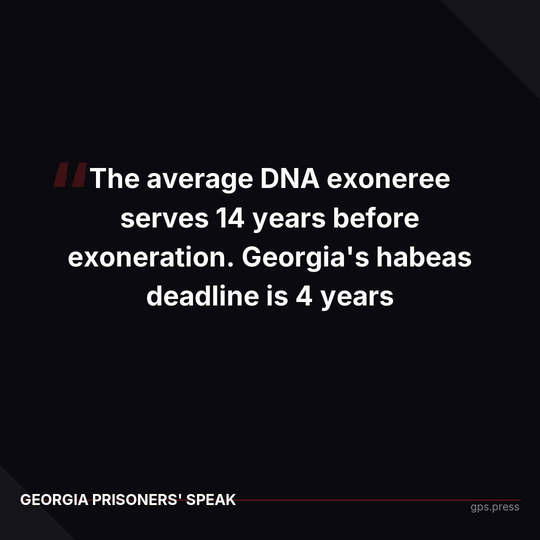 The average DNA exoneree nationally serves 14 years before proving innocence. Georgia's deadline is four years. Most innocence claims are extinguished before the evidence to prove them even exists. When the possibility of justice has an expiration date, how many innocent people will die in prison?