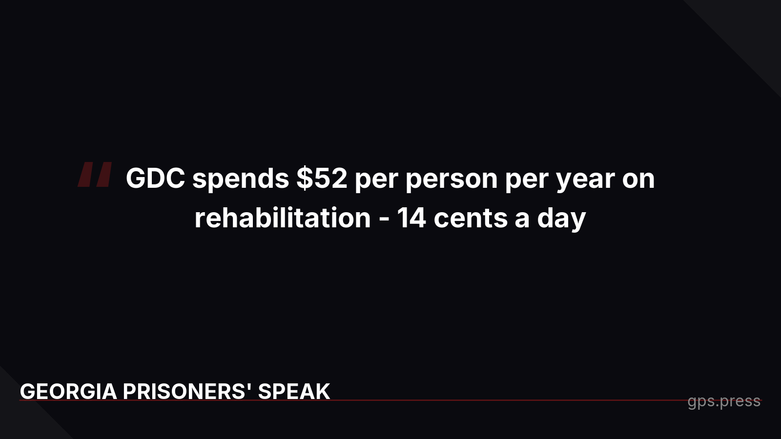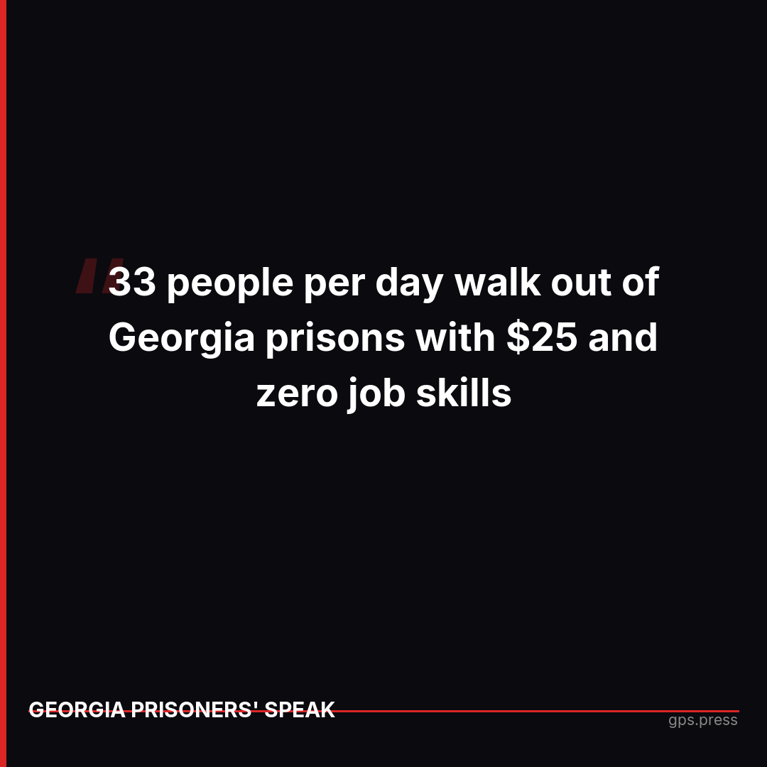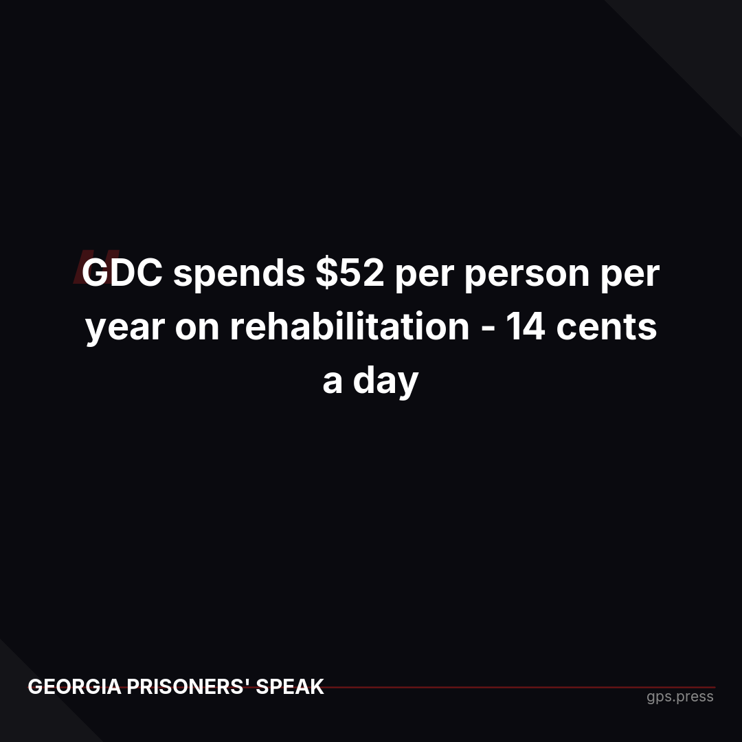 Georgia's Department of Corrections promises to provide rehabilitation opportunities. The reality: $52 per person per year - 14 cents a day. The state allocates 46 surveillance dollars for every 1 dollar spent on programming. Thirty-three people per day return to Georgia communities after years of survival mode with $25 and zero job skills.