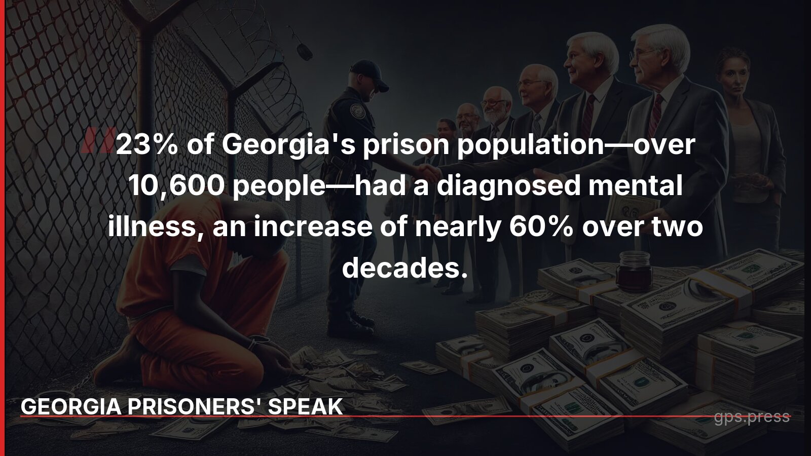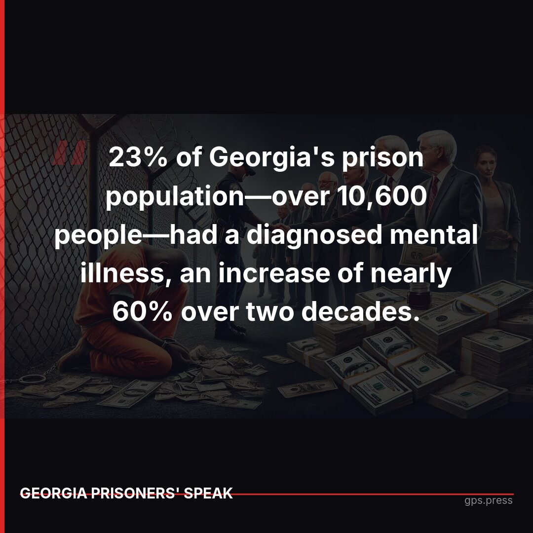 23% of Georgia's prison population has a diagnosed mental illness—over 10,600 people. Meanwhile, Kemp's budget allocates $1.62 billion for corrections while mental health care remains underfunded. https://gps.press/punishment-for-profit-how-georgias-justice-system-...