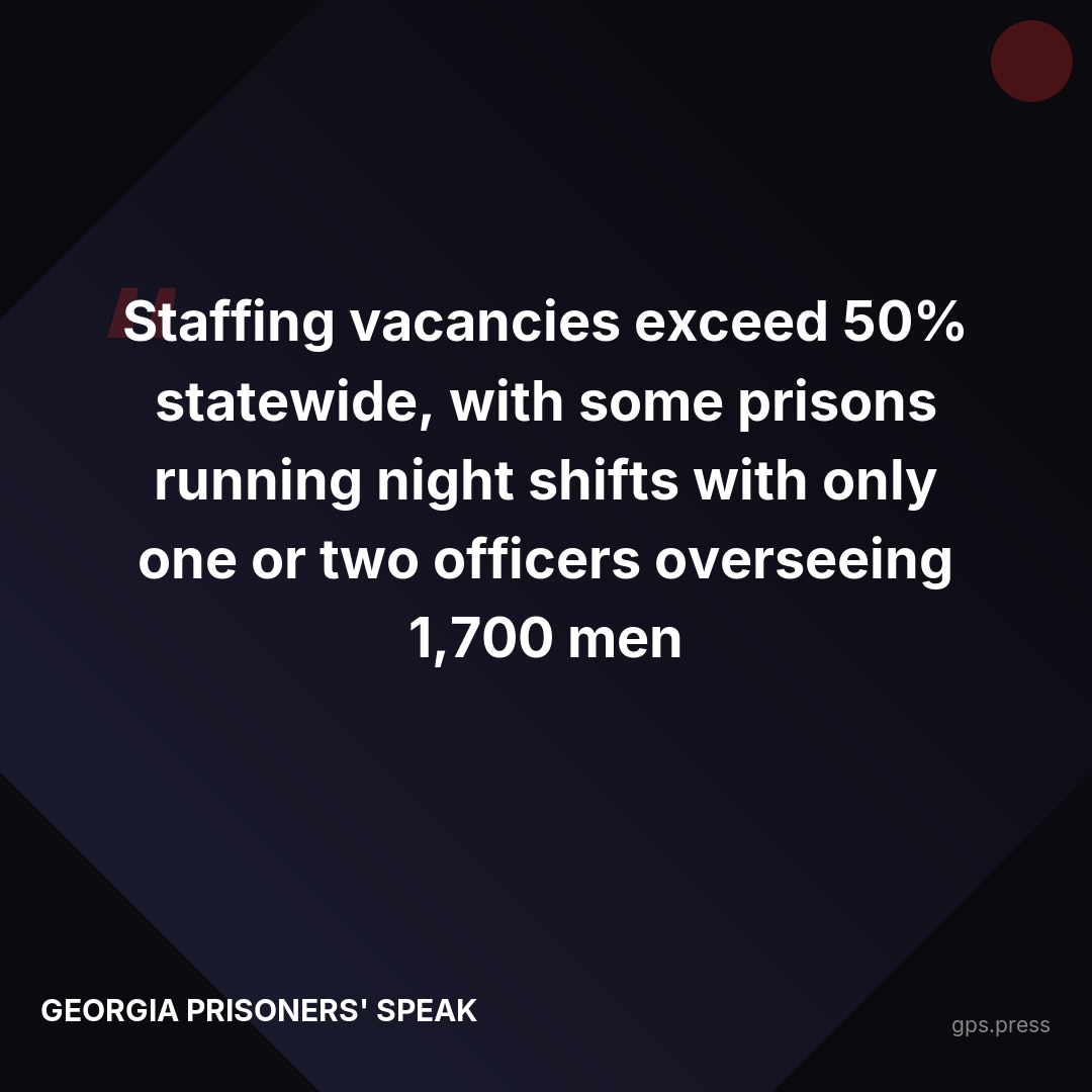 Georgia's prisons are systematically starving people. Prisoners receive as low as 1,200-1,400 calories daily — below survival minimums — while losing 30-50 pounds and developing chronic illnesses. Meanwhile, staffing vacancies exceed 50% statewide, with some prisons running night shifts with only one or two officers overseeing 1,700 men.
