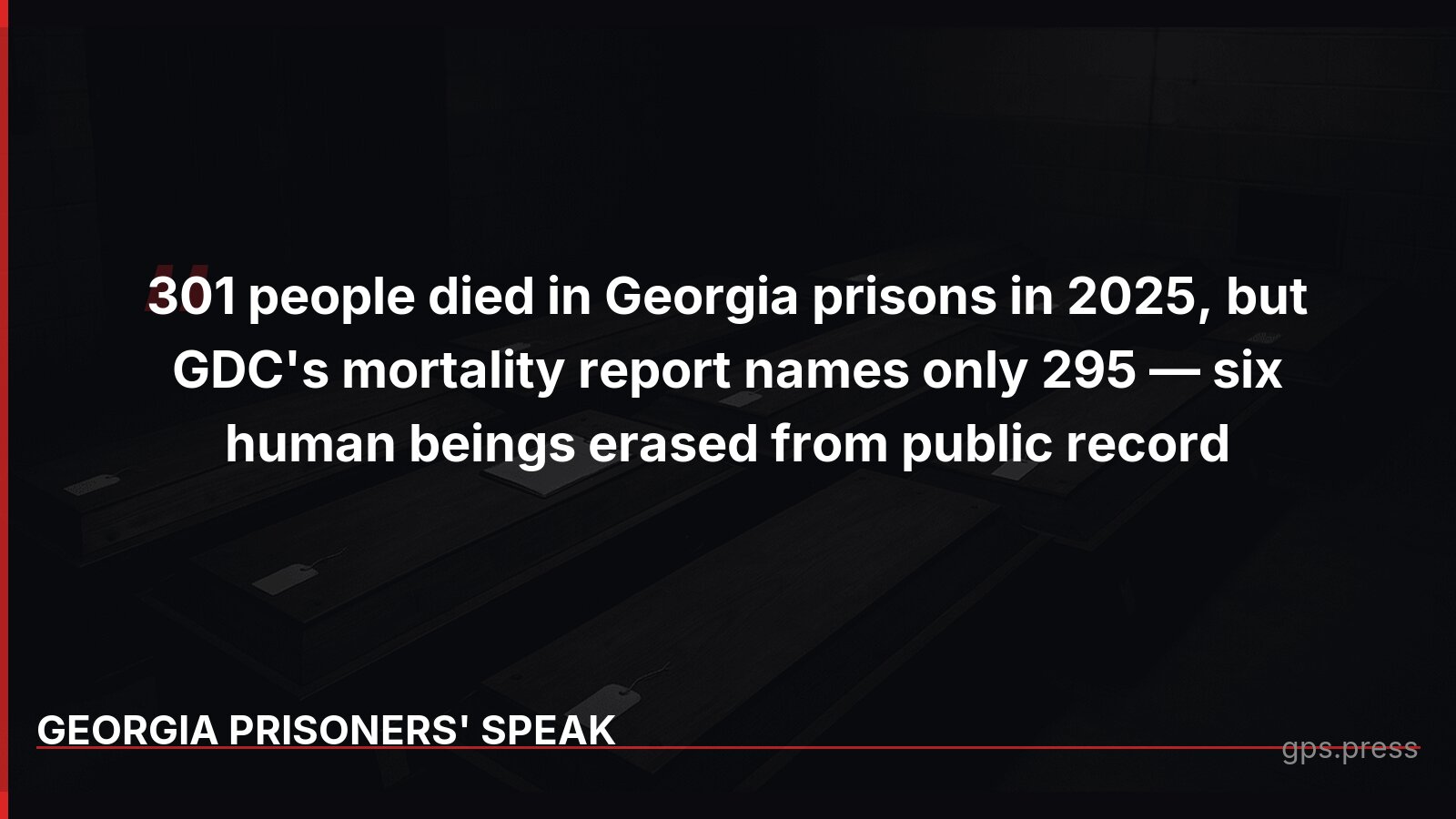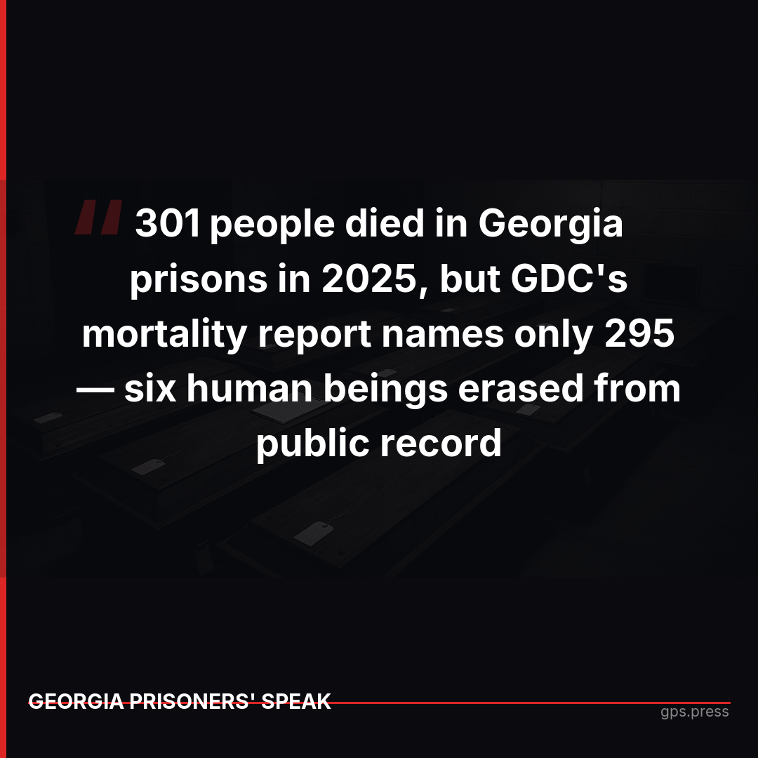 The Georgia Department of Corrections published statistics showing 301 people died while serving state sentences in 2025. But when GPS obtained their official mortality report, only 295 names were listed. Six human beings who died under state authority have been erased from the public record.