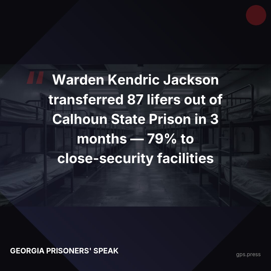 Between February and April 2026, Warden Kendric Jackson transferred 87 lifers out of Calhoun State Prison. 79.3% were sent to close-security (Level 5) prisons — the most restrictive general-population facilities in the state system. Calhoun accounted for 67% of all medium-to-close-security lifer transfers in the entire GDC system during this period. 1